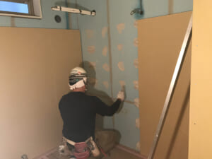 GL工法についてどんな工法かご紹介します。 ボード直張り(GL)工法作業のフロー 1.仕上げ墨出し 2.下地処理 張付け面の清掃 3.GL ボンド混練 4.石膏ボード加工 5.ボード張付け (A) 張付け面